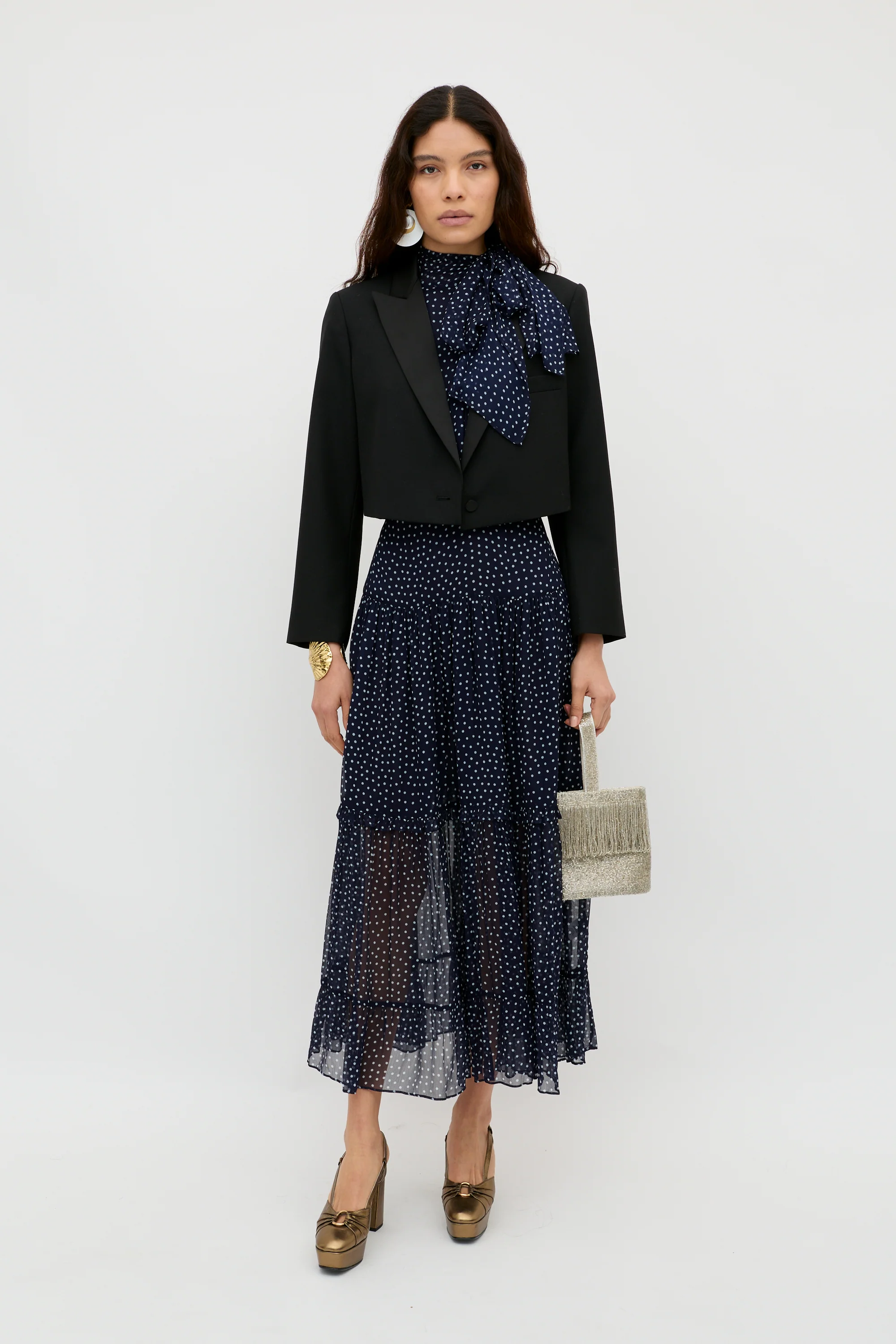 The Abi is an occasion dress in navy georgette with a scarf-style neckline, blousy halter-style body, and tiered midi skirt, all perfect for bridesmaids or occasion wear. Her polka dots are a vintage-inspired print that will never date.