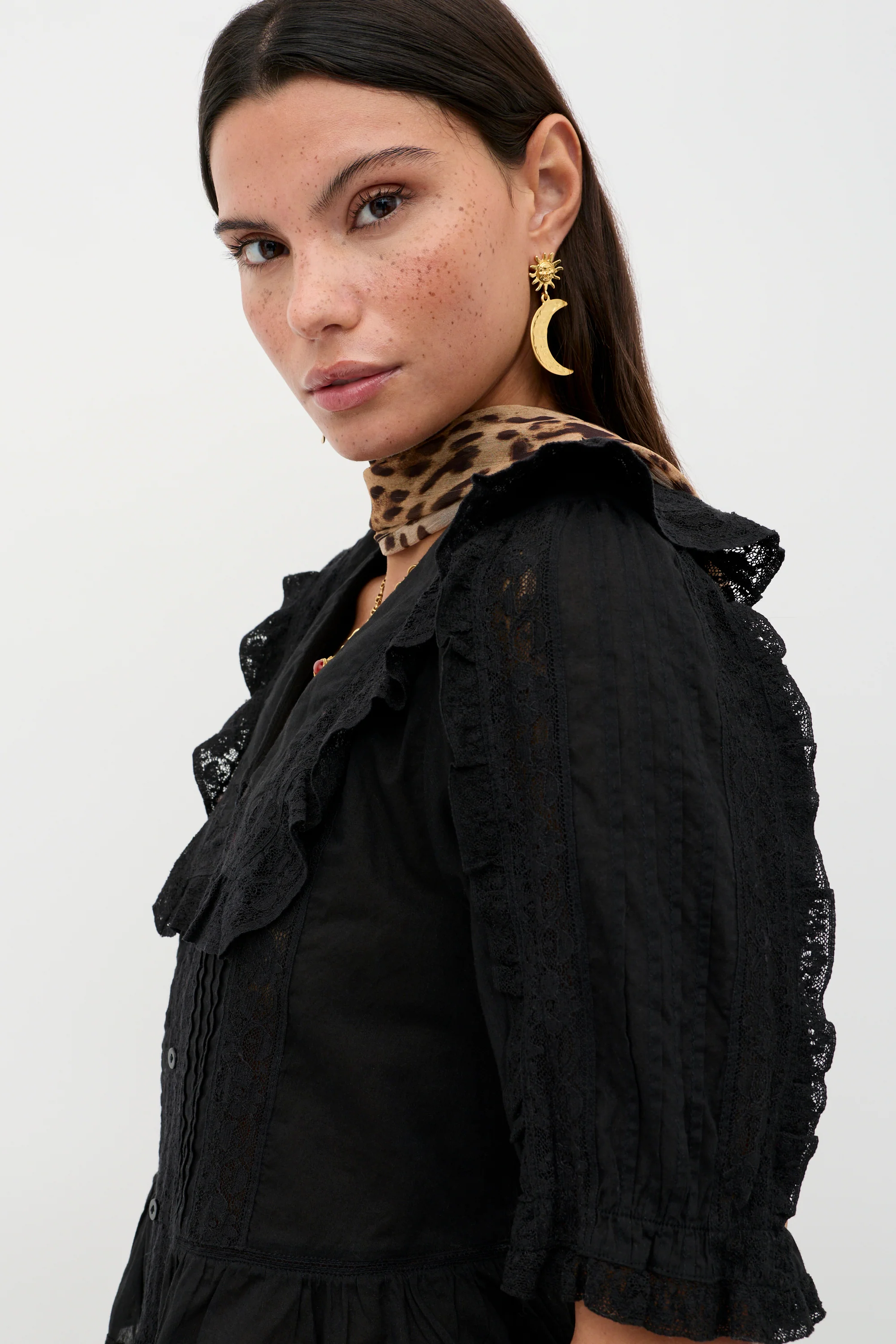 The Ellery is a romantic black cotton button-down top with a ruffled collar, blousy sleeves, and antique-look lace. She is just as timeless as the vintage that inspired her and has a relaxed and floaty fit that flatters every figure.