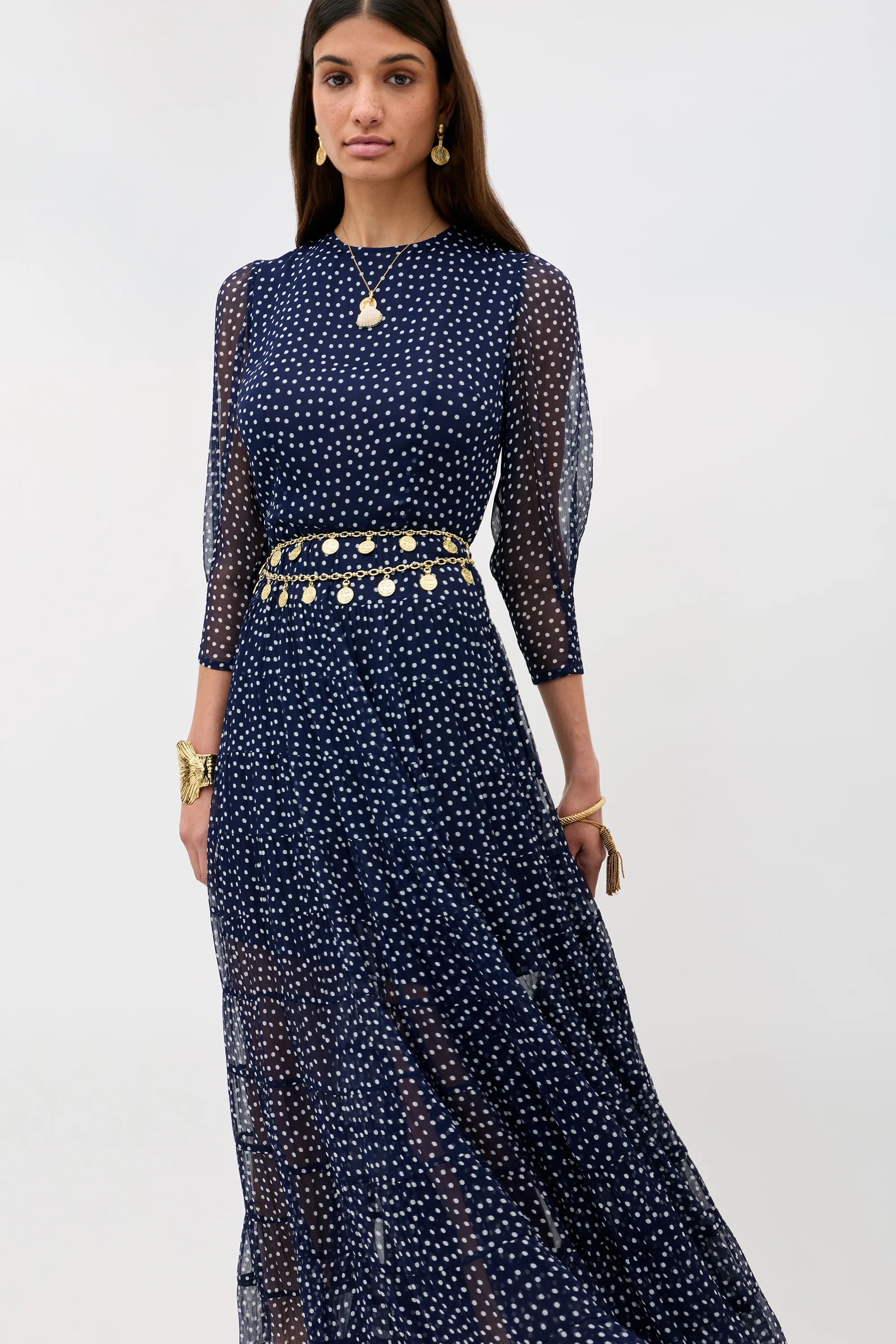 The Kristen tiered-skirt dress is beloved among #HumansofRIXO and so special in our ivory-on-navy spot print. Push her part-shirred cuffs up to give her sleeves more puff and cinch her floaty georgette with our suede Catalina belt, seen here.